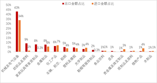 虽然我国制造业体量大、门类全,但我国分品类的出口金额占比和进口金额占比分布仍然高度一致,说明在整体上仍以加工制造为主。除个别品类(纺织制品、家居制品、鞋帽服饰)以外,在单品类内部尚未形成完整的产业链。