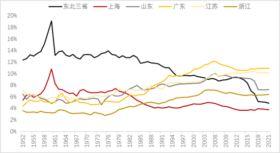 2004年前后,重化工业化进一步向高端制造转型,并以中心区域辐射为特征。珠三角、长三角地区经济持续快速发展,山东GDP占比则随东北三省一起回落。