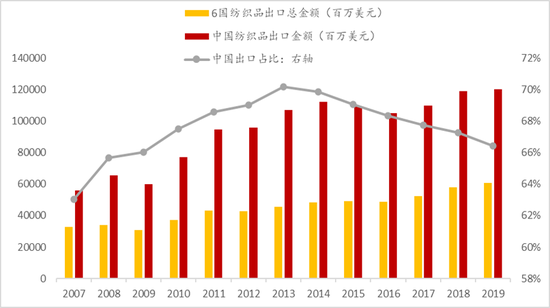 2010年后,纺织品、家具、电机、电信设备成为东南亚国家增长最快的出口品类。中国纺织品及原料出口金额相对印尼、泰国、马来西亚、越南、菲律宾、巴西的占比由2013年的70%下降至2019年的66%。