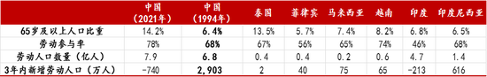 英美等发达国家已进入或正向超老龄化社会过渡,以东南亚六国为代表的发展中国家,其老龄化程度也高于1994年的中国(除菲律宾外)。从劳动人口数量衡量,越南等国家对我国形成的劳动人口替代量较小。印度作为人口大国,但劳动参与率不足50%,近10年来劳动人口仅增加1300万人,近3年劳动人口更出现了负增长。因此,我国当前面临的外部劳动人口替代效应明显弱于1994年的日本。