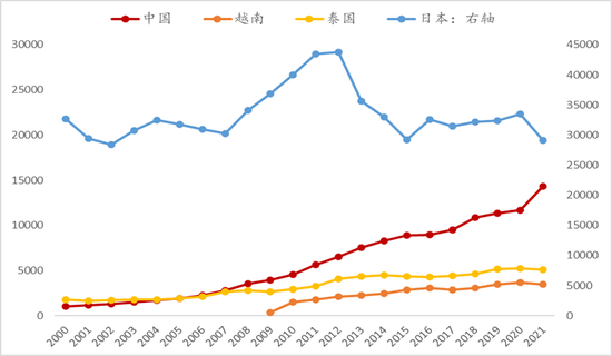 1970-80年代,日元大幅升值以及日本人力成本快速上升,劳动密集型产业开始外移。2000年,中国制造业人均工资为每年1057美元,仅相当于日本人力成本的3%。2021年我国制造业人均工资提升至每年14295美元,已接近日本的50%。而以泰国为例的东南亚国家,2000年制造业人均工资每年1789美元甚至略高于当时的中国,至2021年时也仅翻了2.8倍(每年5089美元),比中国低了近2/3。我国近年对节能环保的重视,也提高了制造企业的生产成本。