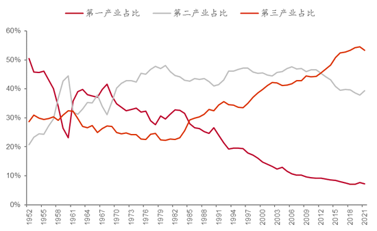 新中国成立以来,我国逐步从农业大国跃迁为工业大国。1970年第二产业GDP占比超越第一产业,并于此后稳定在40%以上。第一产业占比在1952年高达51%,此后持续下行,至2021年仅占GDP总值的7%。