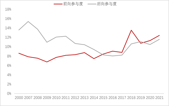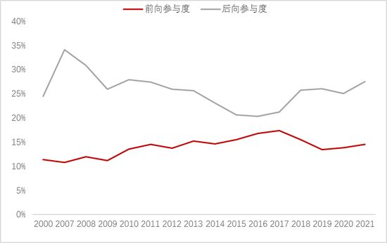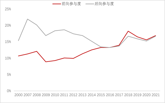 备注:全球价值链参与度计算全球进出口中至少跨境两次的商品,即国家A利用原料生产中间品,将中间品出口至国家B,而国家B则再次加工后出口至国家C。
