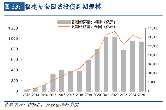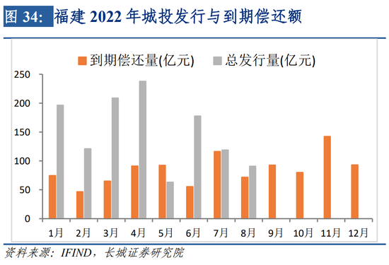 2021年,福建省城投债到期偿还量为1022.41亿元,今年到期城投债规模小幅下降至1020.95亿元,其中今年8月份到期额为140亿元,单月偿还额位于历史平均值。未来三年福建省的城投债到期规模将有所降低,偿债压力减轻。