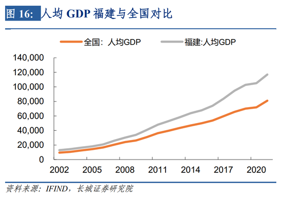 福建省人均GDP名列前茅,对外省人口的吸引力却有待提高。2012年以来福建人均GDP复合增速达9.2%,2021年人均GDP达11.69万元,远超全国的8.09万元,居全国第四,仅次于北京、上海、江苏。不过相对于人民的富裕程度,福建对外省人口的吸引力并不突出,根据《中国人口普查年鉴-2020》,2020年福建跨省流入人口仅为489万人,排全国第六位,远低于广东的2962万人。