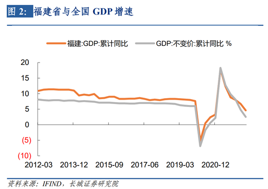 2021年福建省GDP同比增长11.9%,高于同期全国8.1%的增速;受邻近地区疫情等不利因素影响,今年上半年福建省经济增速放缓。数据显示,二季度福建省GDP同比2.6%,上半年累计同比增长4.6%,高于全国增速,位居全国第六。在本文中我们不过多局限于福建省今年在疫情影响下的经济情况,而是从更长的时间维度对福建省经济情况进行简析,并对其财政以及债务情况进行分析。