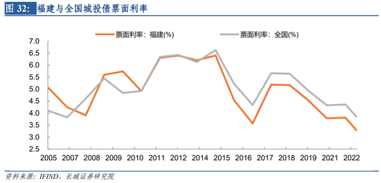全国城投债票面利率自2018年以来进入持续下滑的趋势。同花顺数据显示,2021年全国城投债票面利率为4.36%,较2018年下滑128BP;近十年来,福建城投债利率均低于全国水平,且自2014年以来呈现相近的下滑趋势,较2018年下滑136BP,发行成本进一步压缩。今年截至7月31日,福建省城投债票面利率为3.30%,比全国利率低36BP,低于全国平均水平。