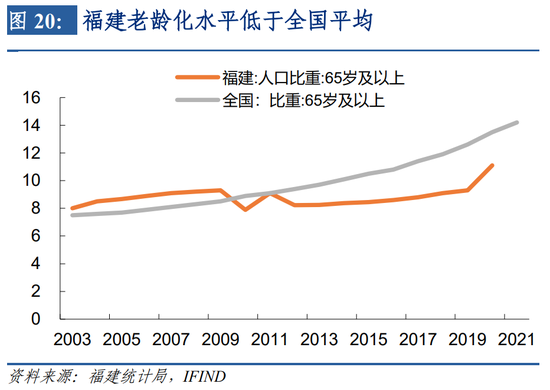 福建省人口出现老龄化趋势,但速度慢于全国。2021年福建省统计局数据显示,福建省65岁及以上人口占比11.10%,低于全国的13.5%。福建省统计局局长陈立华在第七次全国人口普查主要数据结果新闻发布会上表示,“六普”时福建已经步入老龄化社会,60岁以上人口占比超11.42%,2020年“七普”这一比重升至15.98%,福建的人口老龄化程度进一步加深。但是福建人口老龄化速度慢于全国,2013年以来65岁以上人口占比增速明显低于全国平均水平。福建统计局分析指出,福建作为劳动力资源较为丰富的省份,吸引了220多万的人口净流入量,一定程度上延缓了老龄化进程。