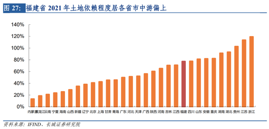 虽然福建省财政实力雄厚,但也存在着对土地的依赖程度较高的问题。我们以成交土地出让金占地方公共财政收入的比例作为衡量土地依赖程度的指标,从2021年数据来看,福建省的土地依赖度居全国各省市中游偏上水平,事实上近10年以来福建省土地依赖度一直高于30个省市的平均水平,表现出一定的土地依赖倾向。