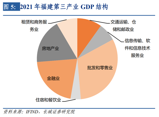 2021年福建金融业同比增速放缓至5.99%左右,但福建金融增业加值排全国各省份第五,结合其第八的经济总量排名,可见金融业对全省的经济影响较大。今年上半年,福建省服务业增加值同比增长3.8%,高于全国水平(2%)。显示福建有效应对新冠疫情的冲击,其中增速最快的三个行业为信息传输、软件和信息技术服务业、金融业和批发和零售业,增速分别为12.7%、7.8%和6.0%。