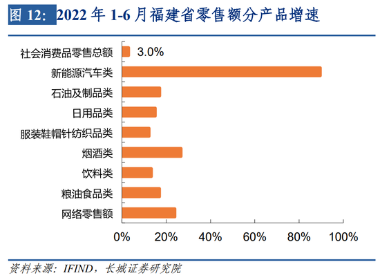 消费方面看,福建省消费市场不断发展,市场规模再创新高。2021年福建居民人均可支配收入为5.1万元,比全国平均水平高0.4万元,同比增长9.3%,排全国第七位。2021年福建社会消费品零售总额首次突破2万亿元大关,实现20373.11亿元,比上年增长9.4%,低于全国平均增速(12.5%)。2022年上半年福建消费总额1.05万亿元,同比增长3.0%,高于全国水平(-0.2%)。今年上半年福建省文娱类商品销售旺盛,网络零售保持较快增长,餐饮消费不断提升,石油及制品类商品保持持续增长的态势。