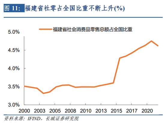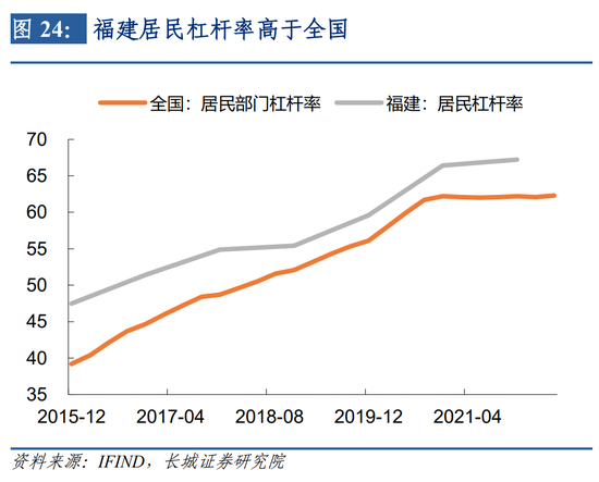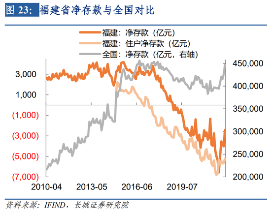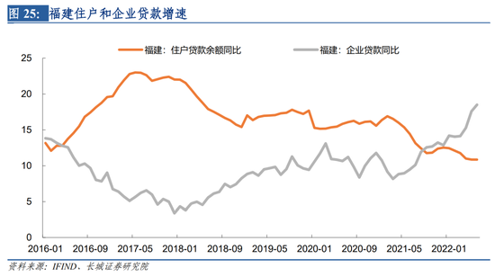 值得一提的是,福建省人民币净存款(存款-贷款)自2018年12月开始至今持续为负值,我们认为这可能与福建省较高的居民杠杆率互为印证。事实上,早在2017年4月份福建省居民净存款就已经开始为负值,对福建人民币净存款拖累较为明显。2015年以来,福建居民部门杠杆率(居民贷款占GDP比重)也持续高于全国水平,2020年福建居民部门杠杆率首次超过60%,达到66.4%。今年以来,福建净存款出现明显回升趋势,其中居民部门净存款也有小幅回升。人民银行福州中心支行在“2022年上半年福建省金融运行情况及相关政策”新闻发布会上介绍,今年上半年福建省本外币各项存款余额7.1万亿元,增速创近9年同期新高,增速居全国第3位,本外币各项贷款增速创近8年同期新高,增速居全国第3位。