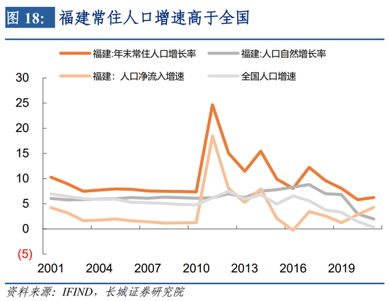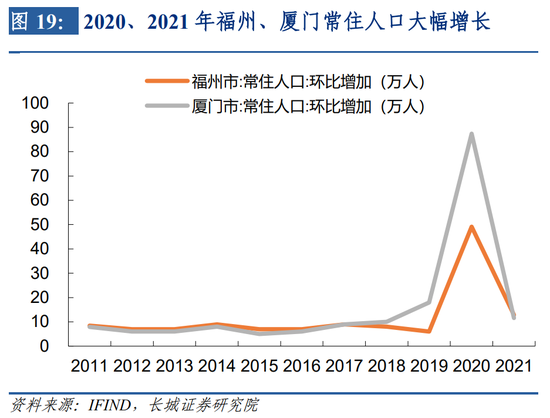 福建外省人口流入增速从2011年达到顶点后开始减慢。福建统计局指出可能是由于流入福建的人口主要来自贵州、四川、江西,近年中西部等人口流出地区经济快速发展,带来外出人口的回流。2020年、2021年人口流入增速重新提高,可能受益于福建省落户政策的大幅放开。2020年6月福建省公安厅、福建省发展和改革委员会印发《关于深化户籍制度改革促进基本公共服务均等化的若干措施》,取消福州、厦门两市连续居住年限要求。2020年12月,福州市公安局印发《关于进一步降低落户条件壮大人口规模的若干措施》实施细则的通知,“零门槛”落户福州。2020年与2021年福州、厦门常住人口分别环比增加136万人和24万人。