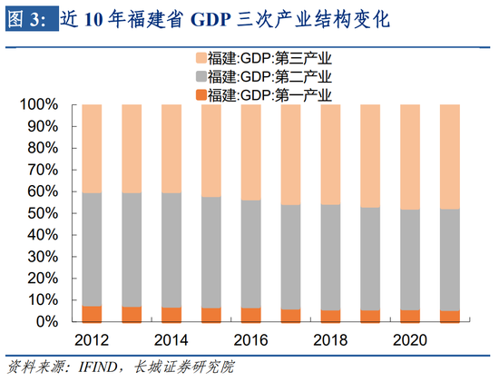 2021年福建三次产业占比为5.9:46.8:47.2,相比于全国的7.3:39.4:53.3,福建省二产占比明显较高,相应的,去年福建工业增加值占全国比重达到4.77%,占福建GDP比重为36.4%,工业对GDP增长的贡献率排名全国第七,工业作为“压舱石”,对经济的拉动明显。