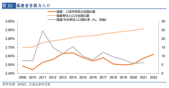 尽管福建省常住人口占全国比重不断上升,人均GDP也始终位于全国前列,但福建省对资金的吸引力却不够强大。2014年以前,福建省常住人口增长率处于较高增速,人民币存款占全国比重也在较快上升,2014年以后,随着人口增长进入低速期,存款占全国比重也开始呈下降趋势,直到2020年后,这一比重才出现回升,2021年人民币存款占全国的2.62%。