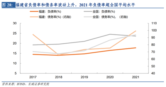 福建省经济总量、人均GDP和财政实力在全国排名参差不齐,以不到全国3%的人口,创造出全国4.3%的GDP,且民营经济增加值占全省GDP的69.3%的实力说明福建省民营经济发达,人均效率产出较高,成为为数不多的对中央财政净上缴省份之一。这种现象在福建省内普遍出现,各地区发展相对平衡,这在全国也极为少见。但同时我们也看到,福建省居民杠杆率和地方政府的土地依赖度均高于全国水平,未来可能制约居民消费需求和地方偿债能力。