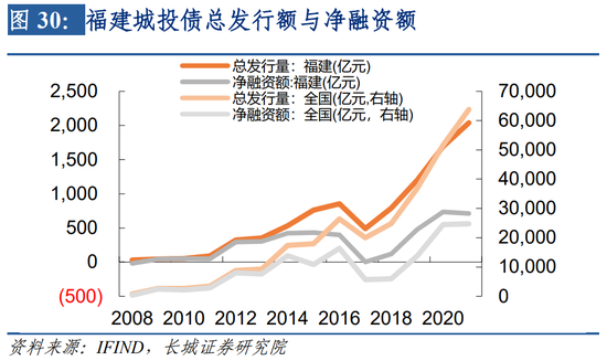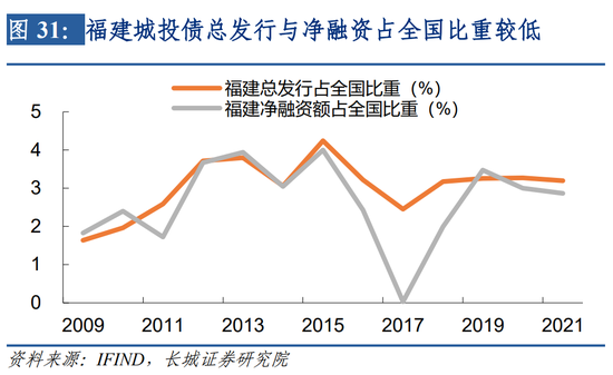 全国城投债净融资整体呈现较强的上升趋势,但在2017年出现明显下滑,净融资同比下降65%,在之后逐渐恢复上升趋势。而福建省城投债净融资整体呈波动较大的上升趋势。2021年,福建省城投债净融资709.08亿元,同比降低3.51%,增速趋缓;福建净融资占全国净融资额的2.86%。今年上半年,福建省城投债发行量略有缩减,净融资额增长较多,总发行量同比下降1.9%至1004.66亿元,占全国比重小幅上升至3.35%;净融资额同比增加38.54%至481.97亿元,占全国比重上升至4.32%。