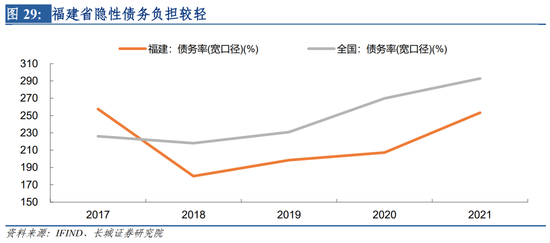 将城投债余额也纳入债务后,福建宽口径债务率也处于较低水平。近五年,福建省宽口径债务率与全国平均水平走势相近,呈现小幅上升趋势,但低于全国平均水平,或体现出福建省隐性债务负担较轻。2021年福建省宽口径债务率为253.34%,全国各省平均水平为292.85%。