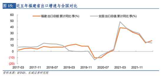 除了对内消费充满潜力,福建省对外贸易也韧性十足。2021年,福建省出口商品总额由2012年的978亿美元增加到1674亿美元,占全国出口总额的5%。今年1月福建省出口商品总额累计增速达37.7%,比全国水平高13.6个百分点。而今年4、5月份,福建省出口受冲击严重,5月累计增速一度跌至12%,低于全国1.5个百分点,但到6月福建省出口增速大幅反弹,累计回弹至18.5%,反超全国平均水平,显示出福建出口的强大韧性。