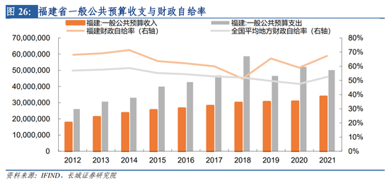 福建省不仅经济实力较强,财政收入也很非常可观。近十年,福建省的一般公共预算收入由2012年的1776.1亿元增加至2021年的3383.4亿元,年均增长6.7%;一般公共预算支出由2607.5亿元增加至5012.9亿元,年均增长6.8%。今年前7个月,福建省实现一般公共预算收入3553.16亿元,同比增长0.5%,远高于全国的-9.2%。以一般公共预算收入占支出比例衡量财政自给率,福建省财政自给率近5年有所提升,且始终高于全国平均水平,2021年财政自给率为67.5%,财政自给能力相对较强。