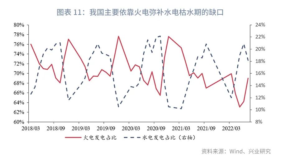 我国的水利发电具有明显的季节性,每年的7、8、9月为水电发电量高峰月份,其他月份主要依靠火电弥补水电枯水期的缺口。