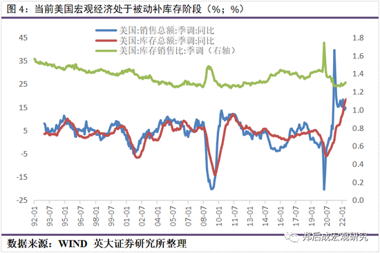 从美国的库存周期看,6月美国销售总额同比录得14.48%,较前值下行0.25个百分点,而6月美国库存总额同比录得18.48%,较前值上行0.54个百分点;6月“美国销售总额同比-美国库存总额同比”这一复合指标录得-4.0个百分点,较前值走阔0.78个百分点。该复合指标在2022年3月进入负值区间,目前已经连续4个月处于负值区间,表明美国宏观经济出现承压迹象,叠加考虑6月美国库存销售比录得1.30%,处于历史低位区间,意味当前美国宏观经济处于被动补库存阶段。根据我们此前复盘的结论,预计美联储大概率在2023年5月左右降息。