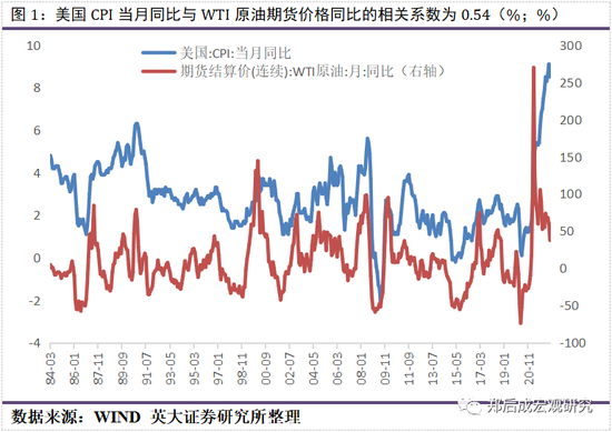 我们认为,美国CPI当月同比与国际油价走势息息相关,或者说,国际油价走势是美国CPI当月同比走势的主导因素。这一判断的依据有三点。第一,美国CPI当月同比与WTI原油期货价格同比的相关系数为0.54,介于0.30至0.80之间,属于中度相关。第二,客观而言,0.54的相关系数并不高,并未达到高度相关。这是否意味着无法从WTI原油期货价格同比的走势研判美国CPI当月同比的走势呢?从图形走势上看,WTI原油期货价格同比的高点(低点)或领先于美国CPI当月同比的高点(低点),或同步于美国CPI当月同比的高点(低点)。之所以二者的相关系数仅为0.54,是因为存在WTI原油期货价格同比的高点(低点)或领先于美国CPI当月同比的高点(低点)的情况,这就压低了美国CPI当月同比与WTI原油期货价格同比的相关系数,如2004年10月WTI原油期货价格同比到达74.97%的阶段性高点,但是美国CPI当月同比在2005年9月到达阶段性高点4.70%,滞后时长为11个月,再如2013年7月WTI原油期货价格同比到达19.15%的阶段性高点,但是美国CPI当月同比在2014年6月到达阶段性高点2.10%,滞后时长同样为11个月。第三,在美国CPI的12个分项中,与原油高度相关的能源分项的标准差为10.74,在12个分项中位列第一,表明能源项的波动性最大,是美国CPI的主导项。