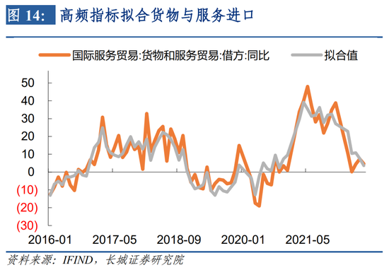 货物和服务进口同比我们筛选了两个指标, CRB现货指数同比可以较好地体现我国进口商品价格变动;韩国作为我国重要外贸交易对手,其向中国出口金额同比与我国货物和服务进口相关度也较高。上述两个指标对进口同比的解释度(R平方)达到82%以上,并且更新频率分别为日度和旬度,可以较好地跟踪国际货物与服务贸易的进口。