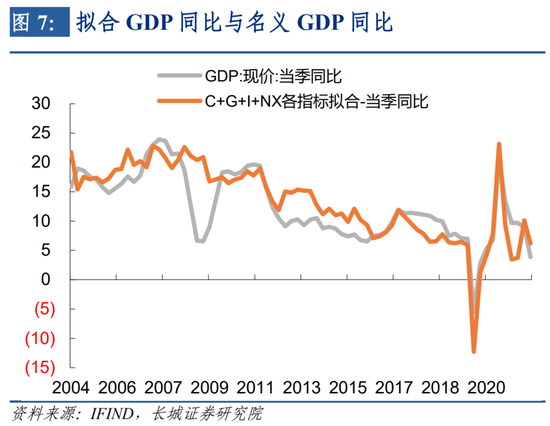 取得上述月度数据后,按照每年相应部分占GDP的比重进行加权平均,拟合出月度GDP同比增速,拟合效果均较好,季化后与统计局公布的名义GDP季度同比的相关系数超0.8,解释度(R平方)约为0.65,证明我们的方法比较可取。其中2008、2009年拟合出的GDP同比明显高于GDP同比,我们认为这段时间统计局公布的社会消费品零售总额和财政支出增速都高于GDP相对应的居民消费和政府消费。