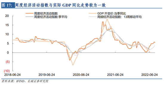 综合我们筛选出的高频指标进行修匀、变频、日期对齐、空缺填补等数据处理后,采取加权平均拟合,得到实际GDP同比周度拟合。这一拟合值涵盖了居民消费、政府消费、固定资产投资、净出口、物价五方面的变动。实际上这一方法得到的拟合值与实际GDP同比存在一个较为稳定的误差,我们把近四年的误差取均值,作为常数对拟合值进行调整(这一稳定误差我们约每年调整一次),最终得到我们的周度经济活动指数。
