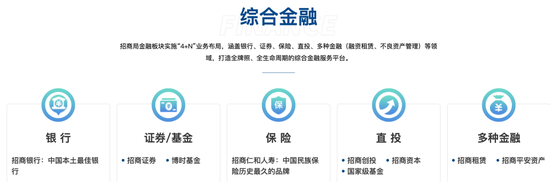 招商局集团官网显示,其金融板块实施“4+N”业务布局,涵盖银行、证券、保险、直投、多种金融(融资租赁、不良资产管理)等领域,要打造成为全牌照、全生命周期的综合金融服务平台。