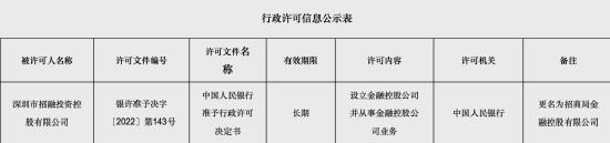 9月2日,央行发布公告,根据相关规定,审查并批准了招商局集团旗下成员深圳市招融投资控股有限公司(下称“招融投控”)的金融控股公司设立许可,并同意其更名为招商局金融控股有限公司(下称“招商局金控”)。