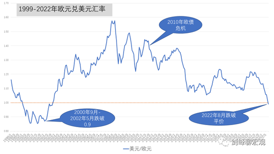 近期欧元兑美元汇率大幅下挫,8月下旬以来已经跌破平价(1欧元兑换不到1美元)。1999年1月欧洲货币联盟成立,欧元正式启动,从那时算起欧元已度过了23个年头。在欧元启动的第二年,欧元也曾经跌破平价,在2000年9月至2002年5月间一度跌到0.9以下。不过,从2002年11月开始迄今,在长达20年的时间里,即使是在2008年全球金融危机和2010年欧债危机期间,欧元都保持着对美元的相对强势地位。