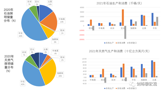 截止2020年,全球石油和天然气探明储量主要集中在中东、独联体(以俄罗斯为主)、中南美和北美,亚太和欧洲的石油探明储量只有全球的3%和1%,天然气探明储量只有全球的9%和2%。从产量上看,中东、北美和独联体位居石油、天然气的前三位。由于能源分布结构与制造业分布结构的错位,亚太和欧洲分别成为石油和天然气供求缺口最大的地区。能源供求的区域分布错位使得能源成为全球最大的单一贸易商品。在2011-2021年间,全球进口货物中,全部制造业产品占比为71%,仅随其后的就是占比达14%、以石油和天然气为主的能源。