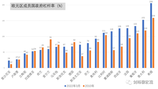 在出现巨额贸易逆差的同时,欧元区政府杠杆率也大幅上升。比较2010年和截止今年3月的政府杠杆率,除了德国、爱尔兰、马耳他之外,其余国家都出现了不同程度的上升。在当年引发欧债危机的希腊,政府杠杆率已经突破了200%,而在法国、意大利、西班牙等三大经济体,政府杠杆率也大幅上升,西班牙的政府杠杆率接近于翻番。