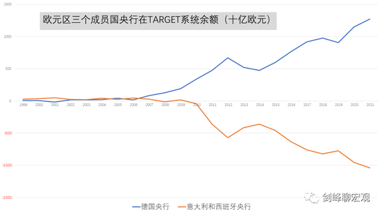 以欧元区最大的债主、德国和最大的两个债务国、意大利和西班牙为例。2008年全球金融危机之后,德国央行在Target系统的净债权不断累积,对应的是意大利和西班牙央行不断累积的净债务。2019年,德国央行的净债权超过了9千亿欧元,后两者的净债务则达到近8千亿欧元。2021年,德国央行的净债权进一步上升到近1.3万亿欧元,后两者的净债务则超过了1万亿欧元。所以,本质上看,这就是南方国家向北方国家“打借条”——如果用黄金来清算的话,按照1800美元/盎司的黄金价格,大约等于2万吨黄金。