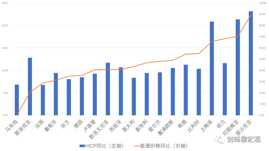 无论是欧元区的北方国家,还是南方国家,2022年3月俄乌战争爆发后,飙涨的石油和天然气价格都对其形成了严重的冲击。首先是恶性通货膨胀。随着全球原油和天然气价格迅速飙升,原油价格甚至一度达到1861年以来的最高峰值,欧元区消费价格协调指数(Harmonized Index of Consumer Price,HICP)中的能源价格涨幅高达40%,在部分国家甚至是翻倍的上涨。能源价格推动了HICP的快速上涨,7月份欧元区HICP平均同比高达10%以上,在一些边缘国家(如爱沙尼亚),甚至超过了20%。
