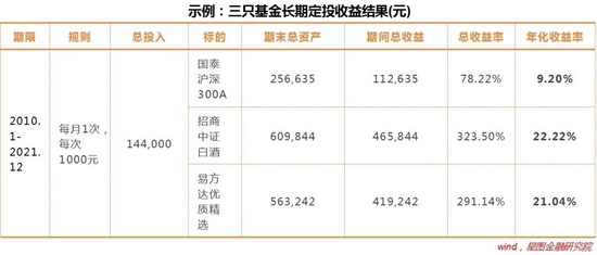 一项长期定投计划实施下来,结果会如何呢?我们不妨做个回溯测试。假定从2010年1月-2021年12月,精选三只基金国泰沪深300A(宽基指数)、招商中证白酒(行业指数)、易方达优质精选(明星基金),每月分别定投1000元,设定红利再投资,期间累计定投144次,每只基金总投入14.4万元,结果如下: