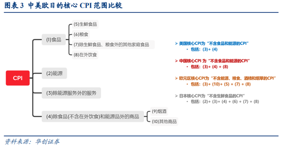 以中美欧日为例,我国和美国的核心CPI均是指“不含食品和能源的CPI”,即便如此,两者也有差异;而欧日的核心CPI概念差别更大,日本的核心CPI是指“不含生鲜食品的CPI”,欧元区的核心HICP(核心CPI)则是指“不含能源、粮食、酒精和烟草的HICP”。(详情参见正文)