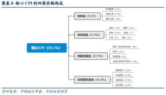 从结果来看,我国核心CPI占CPI的权重大约为73%,但公布月度数据的核心CPI分项合计权重仅约是55.1%。我们将之为四类:耐用品(交通和通信工具、家用器具)权重约5.1%,非耐用品(烟酒、药品、服装和鞋)权重约11.5%,周期性服务(房租、旅游、家庭服务等)权重约21.9%,非周期性服务(通信和邮递服务、教育、医疗服务)权重约14.3%。