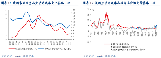 由于劳动力成本上升和消费支出结构的升级,服务类价格都是趋于长期上涨的。服务业是劳动密集型行业,劳动力成本在第二产业中的投入占比仅10.5%,在服务业中的占比则是27.8%。居民服务业最典型的劳动密集型行业,以家庭服务价格为例,过去二十年,其价格走势与我国劳动力成本变化基本一致,美国的经验更能体现出这一特征。
