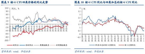 第三阶段,2021年四季度至今,核心CPI同比从1.3%回落至0.8%。周期性服务(1.5%回落至-0.2%)、耐用品(1.8%回落至-0.6%)是主要拖累项,分别边际拖累0.7、0.2个百分点,非耐用品和非周期性服务价格整体保持平稳。