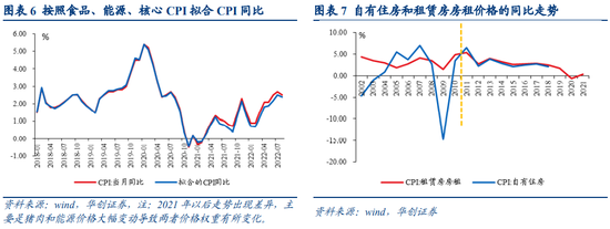 3)“租赁房房租”占比约4.5%,“自有住房”占比约13.5%。去掉“水电及燃料”和“住房保养维修及管理”后,租赁房房租”和“自有住房”合计权重约18%。根据《2020年中国人口普查年鉴》,我国目前约四分之一的家庭租房居住,因此按照1:3的比例,将18%的权重在“租赁房房租”和“自有住房”之间进行分配。