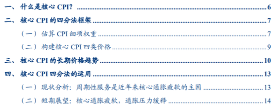 采用“自下而上”的分析思路将核心CPI分为四类价格,分别是耐用品、非耐用品、周期性服务、非周期性服务,分两步进行:第一步是测算CPI细项权重并确定核心CPI范围;第二步是根据核心CPI细分项目的类别进行分类,并结合权重将其整合为四类价格。