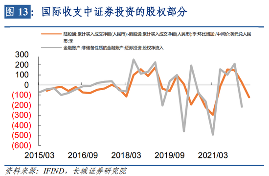 其中证券投资在今年一季度是大幅流出797.56亿美元,是2021年二至四季度不断流入之后的首次净流出。其中证券投资中的股权部分与陆港通-港股通之间的证券投资流动高度相关,今年第一季度大陆和香港之间的证券投资是净流入大陆24亿美元,第二季度大幅流出大陆120亿美元,从这个方向来看,第二季度的证券投资的股权部分也不容乐观。而证券投资中的债券部分与债券通的流入情况高度相关,今年以来通过债券通流入国内债券市场的外资规模大幅下降,WIND数据统计一季度通过债券通净流入资金规模下降接近200亿美元,二季度下降470亿美元左右。证券投资中的债券净流入一季度减少了580亿美元左右,二季度减少的可能会少一些。当前AH股溢价率仍处于高位,说明港股相对于A股仍然比较便宜,资金或更青睐于港股;而债券市场更是因中美利差扩大,到目前已经出现倒挂,投资资金更青睐于收益率更高的外债。