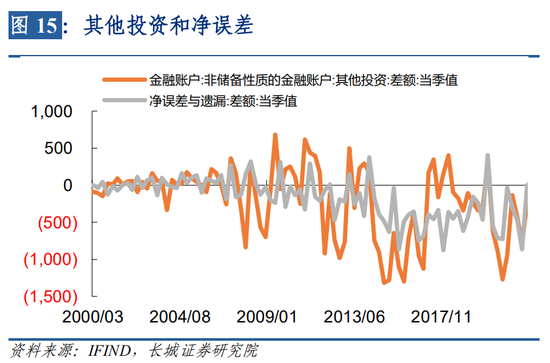 根据《国际收支手册》定义,其他投资指除直接投资和证券投资外的所有金融交易,这些金融交易又被划分为贸易信贷、贷款、货币和存款以及其他资产。净误差与遗漏是为使国际收支平衡表的借方总额与贷方总额相等,编表人员人为地在平衡表中设立该项目,来抵消净的借方余额或净的贷方余额。净误差与遗漏项目能够在一定程度上反映一国国际收支统计质量的高低(根据国际惯例,只要国际收支平衡表中净误差与遗漏占国际收支口径的货物进出口额的比重不超过百分之五,都是可以接受的),我国净误差与遗漏在2005年汇改之后就一直呈现较大幅度波动,2015年第三季度规模甚至达到863亿美元,占同期货物进出口额(2015年第三季度进出口额为10273亿美元)的比重达到8%,远远高于国际惯例的5%。目前中国国际收支平衡表中“净误差与遗漏”是主要来自于经常项目中还是资本和金融项目中还未可知,我们根据两者相关关系,把其列入金融项目中的其他投资一起研究。