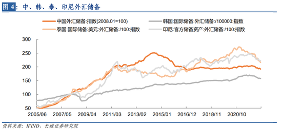 由此可见,国际金融市场的波动对我国外储造成一定的冲击,并且这种现象在各国政府都有出现,我们在四季度宏观报告《世界经济在转折中寻找平衡》中有相关阐述。本文我们选取了韩国、泰国和印尼作为比较国家,以2008年1月为基准100,对各国外汇储备(亿美元)作指数处理,可以发现四国在今年均在下滑。