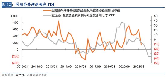 直接投资是国际收支平衡表中金融项目下的重要组成部分,分为股本资本、再投资收益、同公司之间债务交易有关的其他资本,包括直接投资者和子公司、分支机构以及联营企业之间各类资金的借贷。这个指标类似于我们的IFDI-OFDI的指标,今年直接投资的变动主要是IFDI(外商直接投资)波动较大造成的。我们发现在固定资产投资中的利用外资增速领先于IFDI增速大约三个季度。截止到7月份,固定资产投资中利用外资累计增速下降至-36.5%,这一增速水平已经从3月份保持至7月份,目前保持稳定,因此到明年一季度直接投资的下降趋势就会企稳。