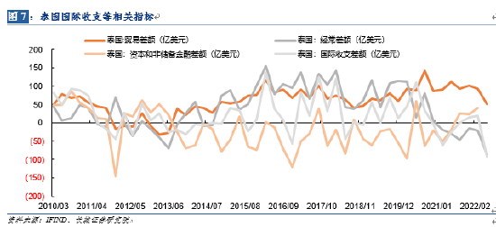 泰国的贸易差额在7月份出现了大幅下降,但经常项目从2021年开始就已经持续逆差,与贸易差额走势产生很大的背离;得益于金融项目的持续流入,国际收支差额今年二季度以前都还是正增长,但二季度大幅减少将近100亿美元,成为促使外汇储备大幅下降的主因,在四国里泰国也是下降最多的国家。