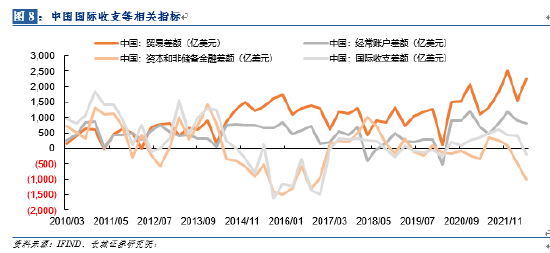 8月5日中国外汇管理局发布的2022年二季度及上半年国际收支平衡表初步数据显示,按美元计值,2022年二季度,我国经常账户顺差802亿美元,其中,货物贸易顺差1757亿美元,服务贸易逆差211亿美元。资本和金融账户中,直接投资顺差150亿美元,储备资产减少190亿美元。可以看出虽然自疫情爆发以来贸易顺差持续扩大,经常账户顺差和国际收支差额也在不断增加,但到今年二季度国际收支差额开始逆转。(本文中的国际收支差额=经常项目差额+资本及非储备金融账户差额+净误差与遗漏)